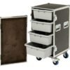 Standing Supply Case with 4 Small Tubs – The case is constructed of 3/8″ plywood with a heavy PVC grey vinyl laminate on the face. Tub drawers are practically unbreakable, lightweight, and are a great and unique feature to this case. The case also has all recessed hardware to prevent shearing off in transit and heavy duty casters also come with the case.
